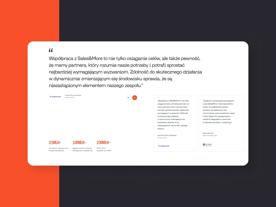 Za każdym udanym projektem stoi seria mądrych decyzji. Zebraliśmy kluczowe pytania dotyczące współpracy Wise People z agencją Sales&More: od strategicznych Warsztatów Discovery, przez rebranding i wdrożenie zaawansowanych efektów wizualnych (3D), aż po finalny UX. Dowiedz się, jak połączyliśmy branding z technologią, by zbudować platformę, która zdobywa międzynarodowe wyróżnienia.